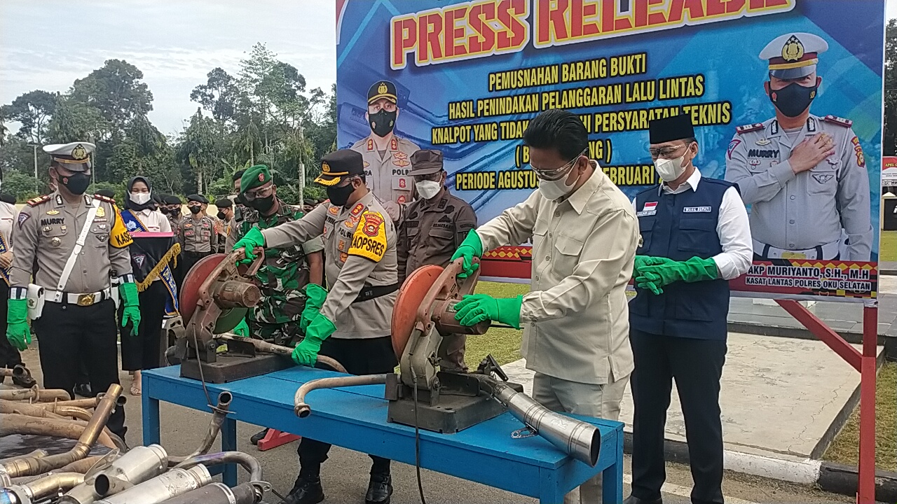 Pemusnahan ratusan knalpot racing ini dikemas pada press release yang dipimpin langsung oleh Kapolres OKU Selatan, AKBP Indra Arya Yudha, SH., SIK., MH yang didampingi Wakapolres OKU Selatan Kompol Iwan, Kasat Lantas Polres OKU Selatan AKP Muriyanto., SH, Kasi Humas Polres OKU Selatan AKP Johan Safri dan PJU lainnya.