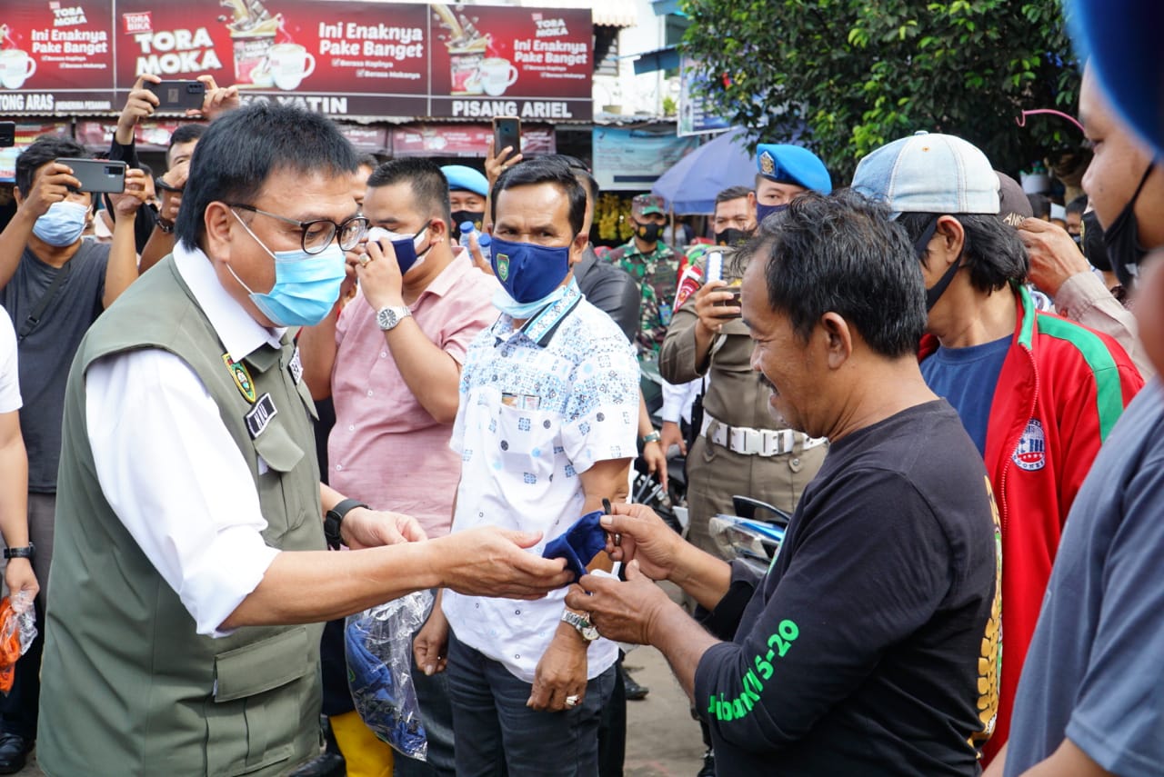 Palembang- Gubernur Sumatera Selatan H Herman Deru (HD) yang diwakili H Nasrun Umar  selaku Sekretaris Daerah Provinsi Sumsel, melakukan sosialisasi dan himbauan protokol kesehatan serta pembagian 10.000 Pcs., masker secara gratis kepada masyarakat pengunjung pasar KM 5 Palembang, Rabu (3/2/2021).