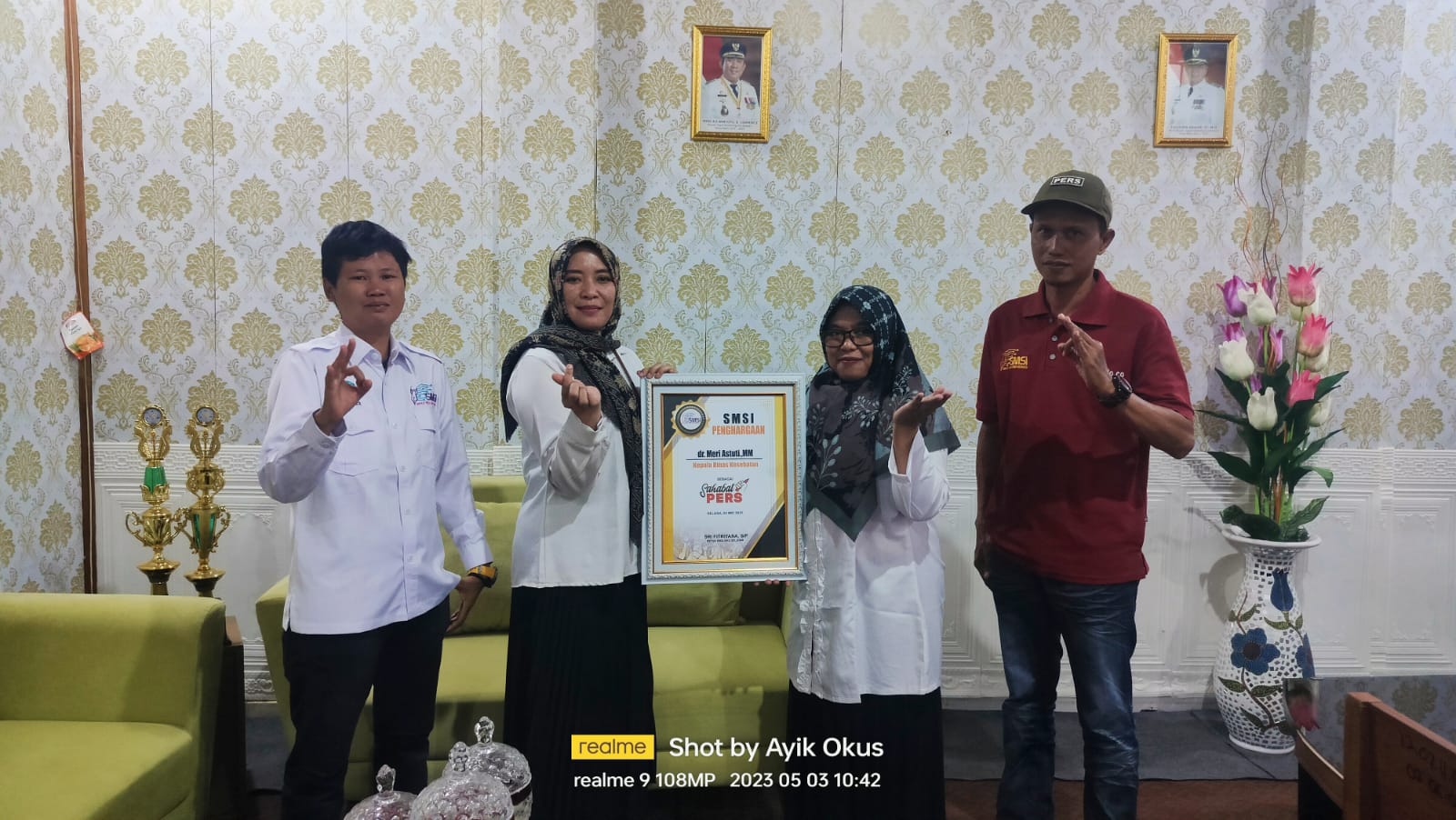Pemberian penghargaan ini diberikan secara langsung oleh ketua SMSI OKU Selatan Sri Fitriyana yang didampingi oleh Suardi Idris selaku Sekretaris dan Hendrian Wati selaku Bendahara di masing-masing ruang kerja keduanya. (SMSI OKU Selatan)