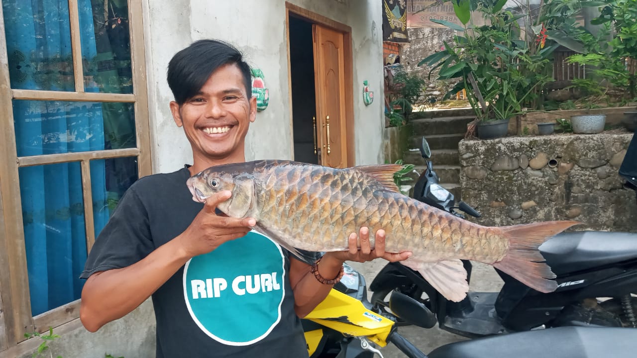 Syawal warga Desa Muara Siban yang beruntung ketika menjala ikan di hilir bendungan air baku mendapatkan jenis ikan semah dengan berat 5 kilogram pada pagi hari ini selasa 4 agustus 2020.
