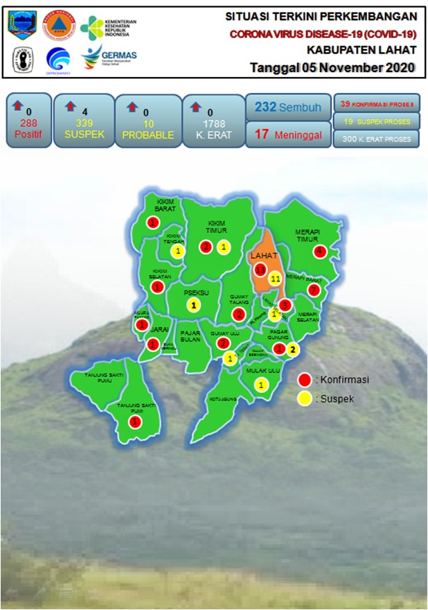 “Ya, setelah kami terima hasil penanganan tim medis, ada perubahan baik. dari 78 pasien terkonfirmasi positif, hari ini ada 39 orang yang telah dinyatakan sembuh”, kata Ketua Tim Gugus Tugas Covid-19 Kabupaten Lahat, Cik Ujang, SH didampingi Kadinkes, Ponco Wibowo, SKM, MM melalui Juru Bicara (Jubir)nya, Taufik Maryansah Putra, SKM, MMMM di Posko Covid-19 Kantor Dinkes Lahat.
