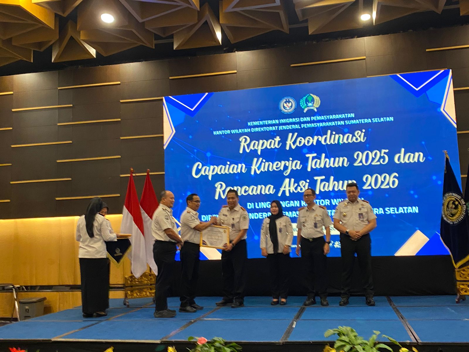 Penghargaan tersebut diserahkan dalam kegiatan Rapat Koordinasi Capaian Kinerja Tahun 2025 dan Penyusunan Rencana Aksi Tahun 2026 yang berlangsung di Ballroom Hotel Aston Palembang.
