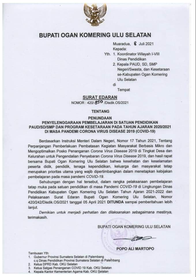 OKU Selatan, sumsel.siberindo.co–Pemerintah Kabupaten OKU Selatan melalui Dinas Pendidikan Ogan Komering Ulu (OKU) Selatan kembali memutuskan menunda Pembelajaran Tatap Muka (PTM) hal tersebut berdasarkan hasil rapat rencana pembelajaran tatap muka di ruang rapat terbatas kantor Bupati Setempat. Kamis (08-07-2021).