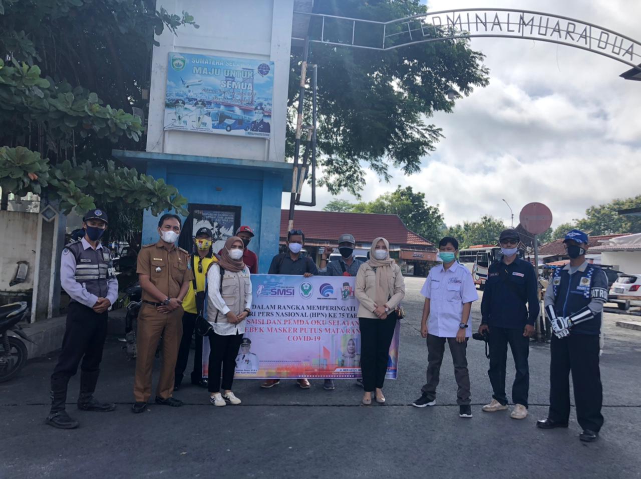 OKU Selatan, sumsel.siberindo.co–Dalam rangka Hari Pers Nasional (HPN) ke-75 tahun 2021, Serikat Media Siber Indonesia (SMSI) kabupaten Ogan Komering Ulu (OKU) Selatan, Provinsi Sumsel, bekerja sama dengan Dinas Kesehatan Kabupaten OKU Selatan gelar Gebrak Masker Gratis di ruas jalan raya Ranau depan terminal Kota Muara dua. Kamis (11-02-2021).