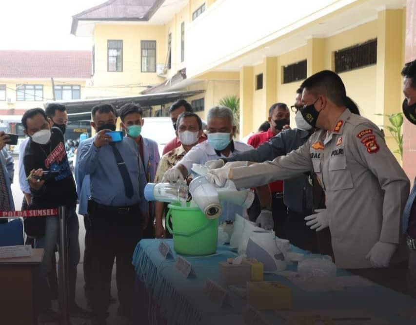 Palembang Sumsel–Direktorat Reserse Narkoba (Ditresnarkoba) Kepolisian Daerah (Polda) Sumatera Selatan (Sumsel) musnahkan 3,1 Kilogram (Kg) sabu dengan cara diblender di halaman DitresNarkoba Polda Sumsel, Kamis (14/10).