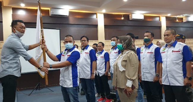 Teks Foto: Pataka: Arwin Za menyerahkan bendera Pataka PBSI kepada Edo Melki sebagai ketua PBSI baru yang terpilih secara aklamasi. Foto Ist