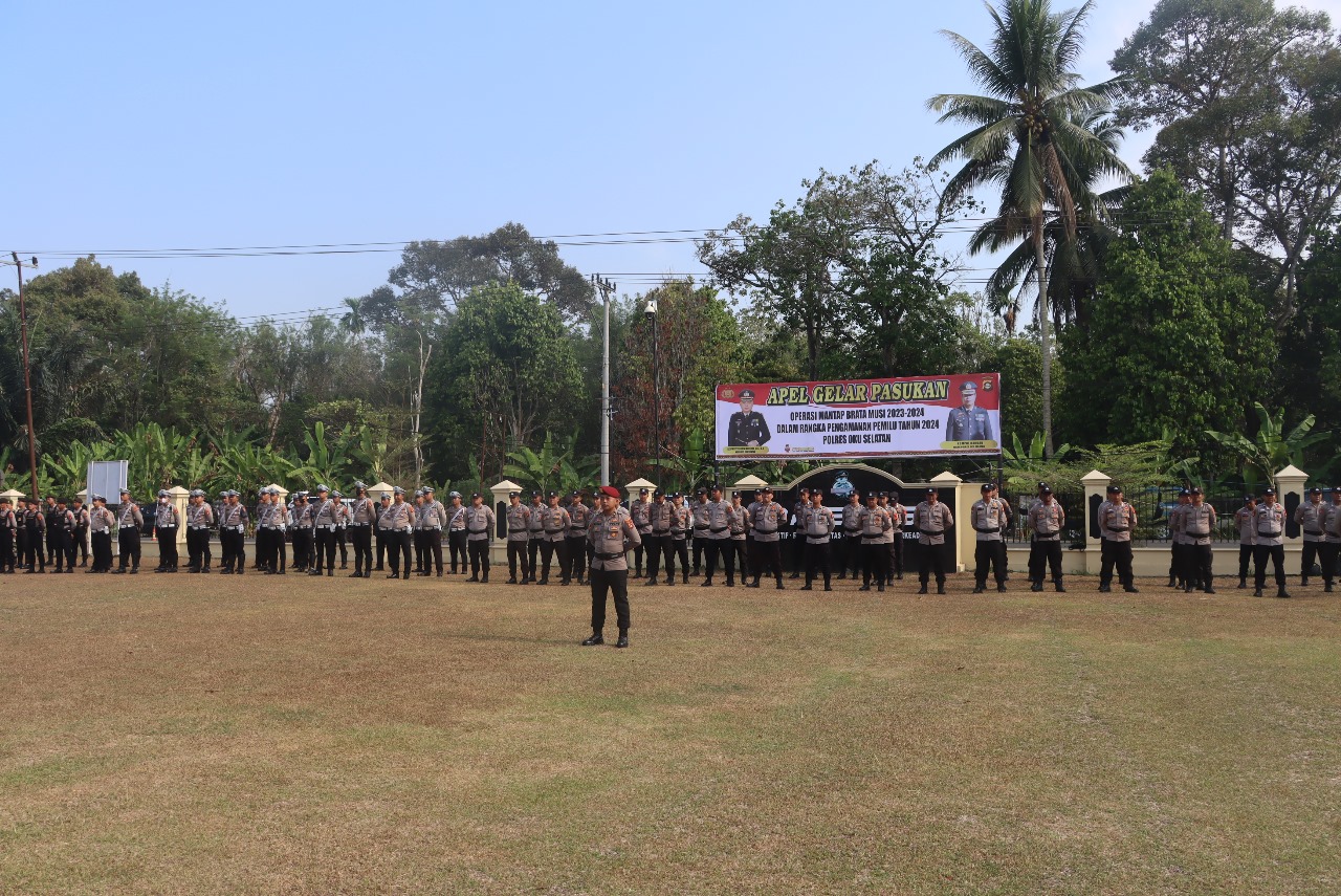 OKU Selatan Sumsel–Polres OKU Selatan Polda Sumsel melaksanakan apel gelar pasukan “Operasi Mantap Brata Musi 2023-2024” dalam rangka pengamanan Pemilu 2023-2024, di Mapolres setempat, Selasa (17/10/2023).
