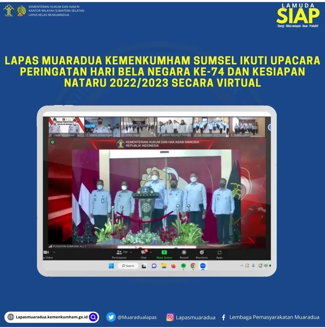 OKU Selatan Sumsel–Pejabat Struktural, Staff, dan CPNS Lapas Muaradua Kemenkumham Sumsel mengikuti Upacara Peringatan Hari Bela Negara Ke-74 dan Kesiapan Nataru 2022/2023 secara virtual di Ruang Serbaguna Lapas Muaradua Kemenkumham Sumsel, Senin (19/12/2022).
