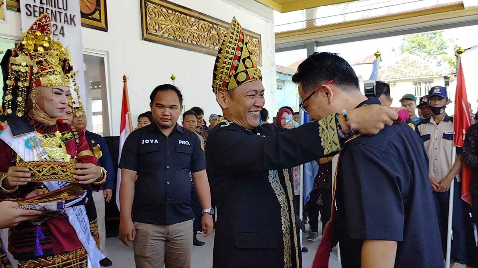 OKU Selatan Sumsel–Komisi Pemilihan Umum (KPU) Kabupaten OKU Selatan menerima bendera Kirab Pemilu 2024 yang dibawa rombongan KPU Kota Prabumulih di Gedung Kesenian Muaradua Dua, Kabupaten setempat. (20/06/2023).