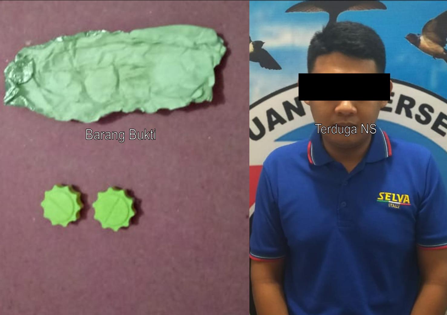 Saat hendak dilakukan penangkapan, lanjut dia, NS mencoba membuangkan selembar kertas timah ke bawah meja yang ada di dalam lobby karoke. Setelah NS diamankan dan petugas melakukan pemeriksaan terhadap kertas timah rokok tersebut, dan didapati BB dua butir pil tablet warna hijau muda berlogo mahkota diduga narkotika jenis pil ekstasi. NS, pun mengakui bahwa BB tersebut adalah miliknya.