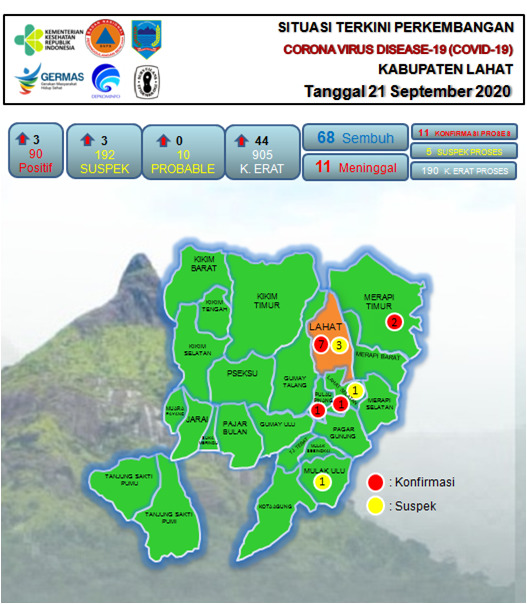 Kabar baik terkait pandemi Corona Virus atau Covid-19 di Kabupaten Lahat, pada hari ini menurun drastis. Pasalnya Tim Gugus Tugas Covid-19 Kabupaten Lahat mengupdate data kasus konfirmasi positif sebanyak 11 orang. Penurunan resiko ini dua kali lipat jika dibandingkan jumlah angka positif pada hari Minggu tanggal 20 September 2020 kemarin sebanyak 22 orang.