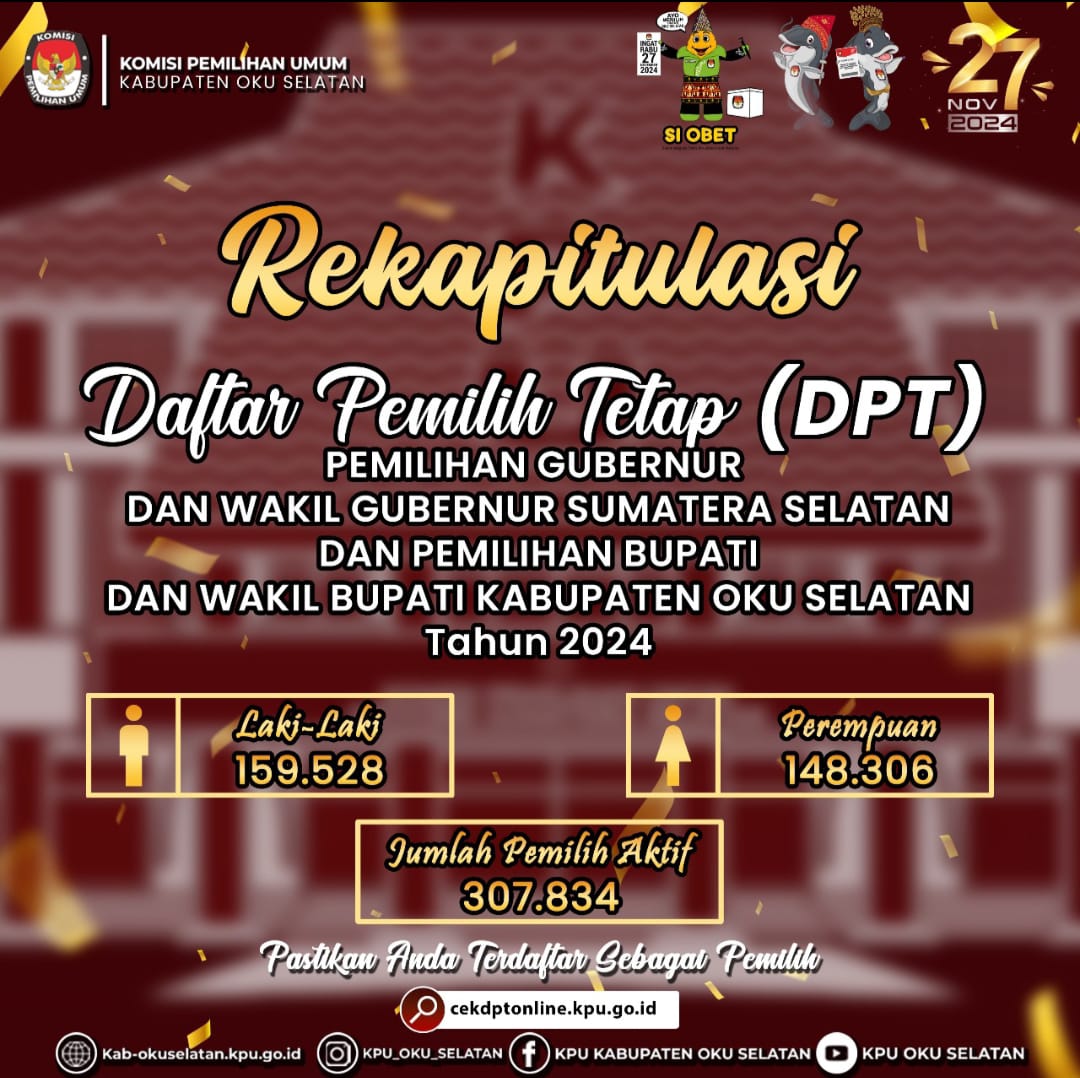 OKU Selatan Sumsel–Komisi Pemilihan Umum (KPU) OKU Selatan telah menetapkan jumlah pemilih tetap (DPT) untuk Pilkada serentak, yang mencakup pemilihan Bupati dan Wakil Bupati OKU Selatan serta pemilihan Gubernur dan Wakil Gubernur Sumsel.