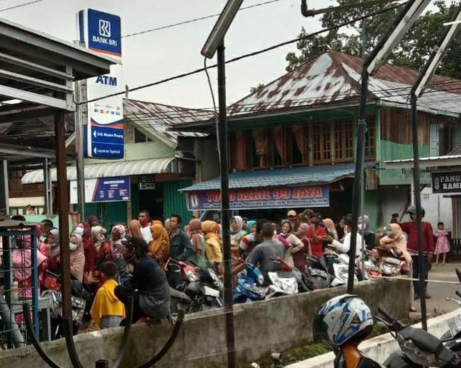 Teks foto: Terlihat kerumunan warga dihalaman bank BRI kecamatan Muara Pinang, untuk mencairkan bantuan BPUM. Foto Bento.