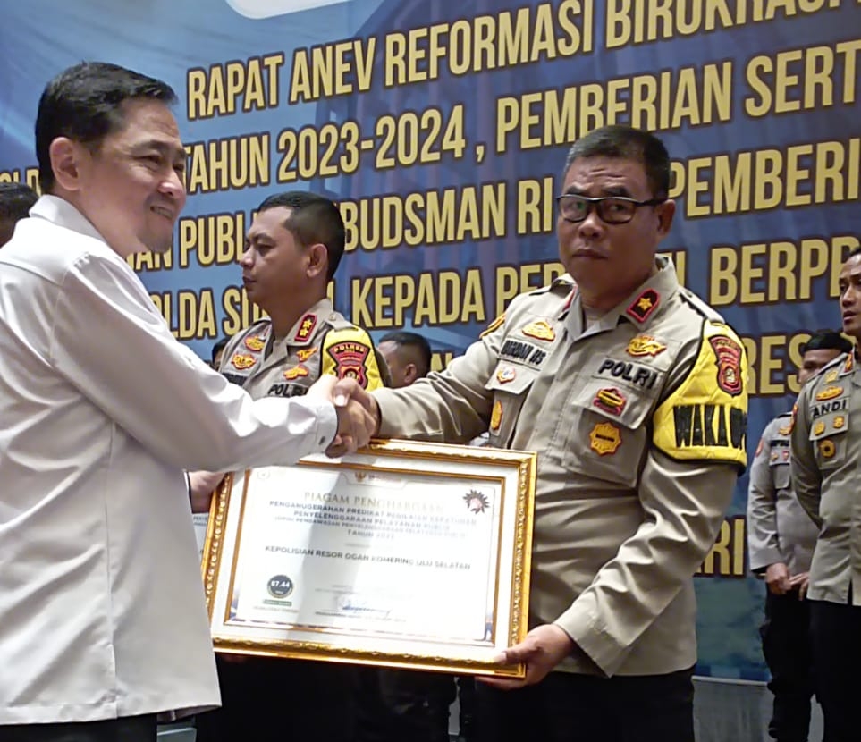 Penghargaan ini diserahkan langsung oleh Wakil Ketua Ombudsman RI Ir Robby Hamzar Rafinus MIA kepada Waka Polres OKU Selatan Kompol Hardan HS pada acara Penganugrahan Predikat Kepatuhan Penyelenggaraan Pelayanan Publik tahun 2023 di hotel Novotel Palembang. Rabu (24/01/2024).