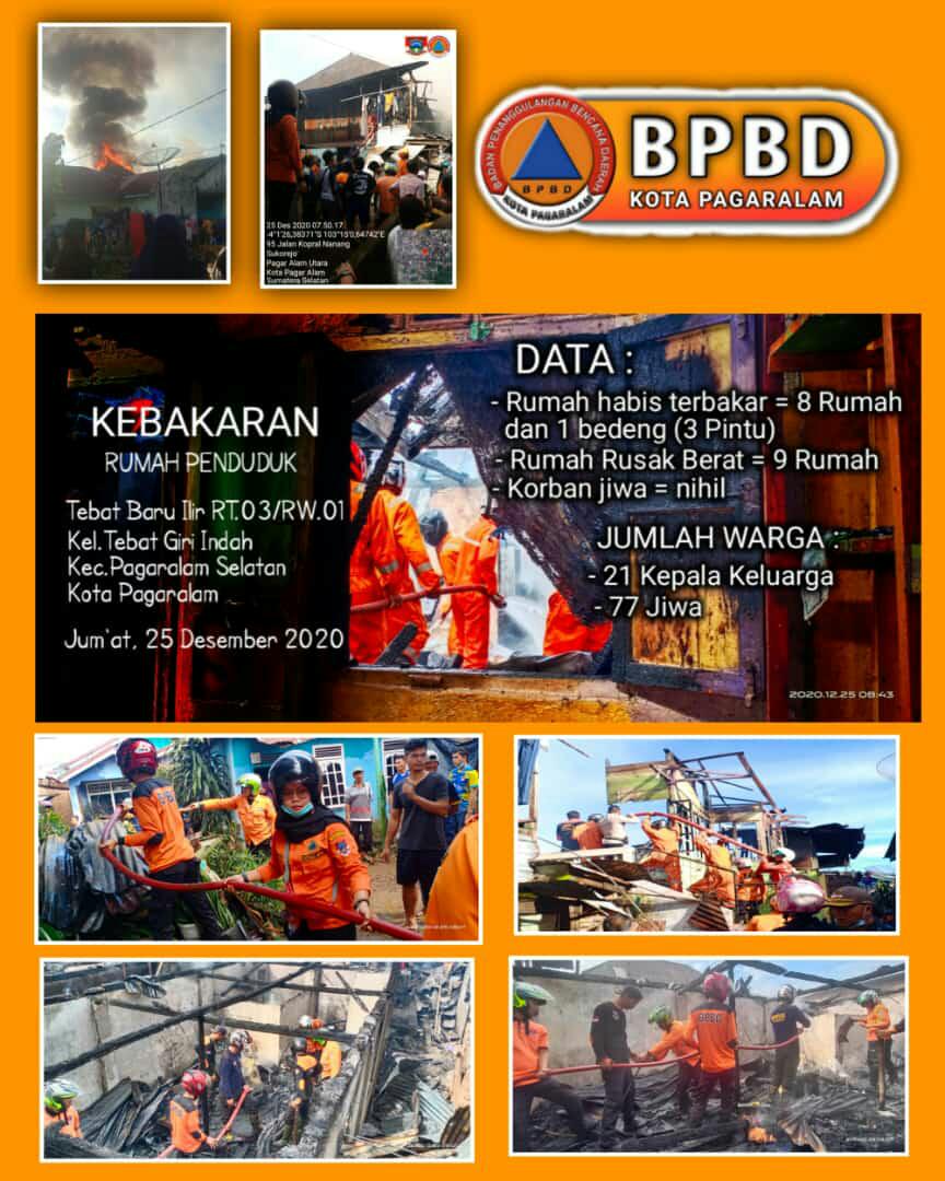 Sumsel, Siberindo.co- Kebakaran hebat terjadi di kawasan padat penduduk Desa Tebat Baru Ilir Kelurahan Tebat Giri Indah, Kecamatan Pagaralam Selatan, Kota Pagaralam Provinsi Sumatera Selatan (Sumsel), sekitar pukul 07.00 WIB, Jumat (25/12/2020) pagi. Akibat kebakaran tersebut, sedikitnya terdapat 21 Kepala Keluarga (KK) kehilangan tempat tinggal, 9 rumah mengalami rusak berat, dan 77 jiwa menginap di pengungsian (bukan lebih dari 5 rumah yang terbakar sebagaimana diberitakan sebelumnya, red).