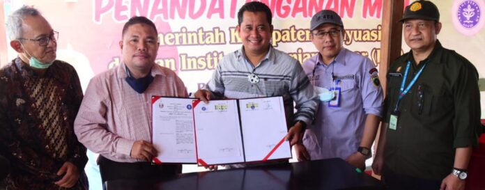 BANYUASIN– Bertempat di Desa Lubuk Lancang Kecamatan Suak Tapeh Kabupaten Banyuasin, Pemerintah Kabupaten Banyuasin melakukan penandatanganan Momerandum of Understanding (MoU) dengan Institut Pertanian Bogor (IPB). MoU ini merupakan kerja sama lanjutan Pemkab Banyuasin dengan IPB pada sektor Pendidikan, Penelitian, dan Pengendalian Kepada Masyarakat.