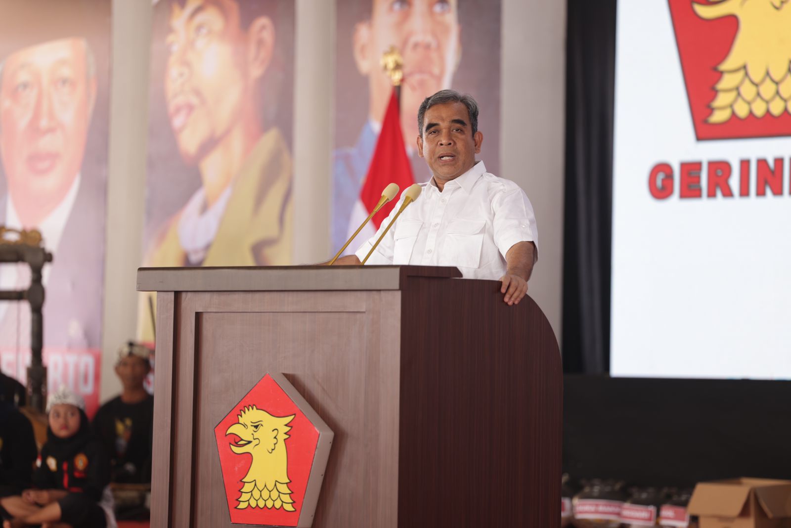 Sekjen Partai Gerindra Ahmad Muzani menghadiri konsolidasi akbar Partai Gerindra Kabupaten Bogor di Jonggol, Sabtu (26/8). Teriakan Prabowo presiden menggema dari ribuan kader Gerindra yang hadir ketika Sekjen Gerindra itu hadir.