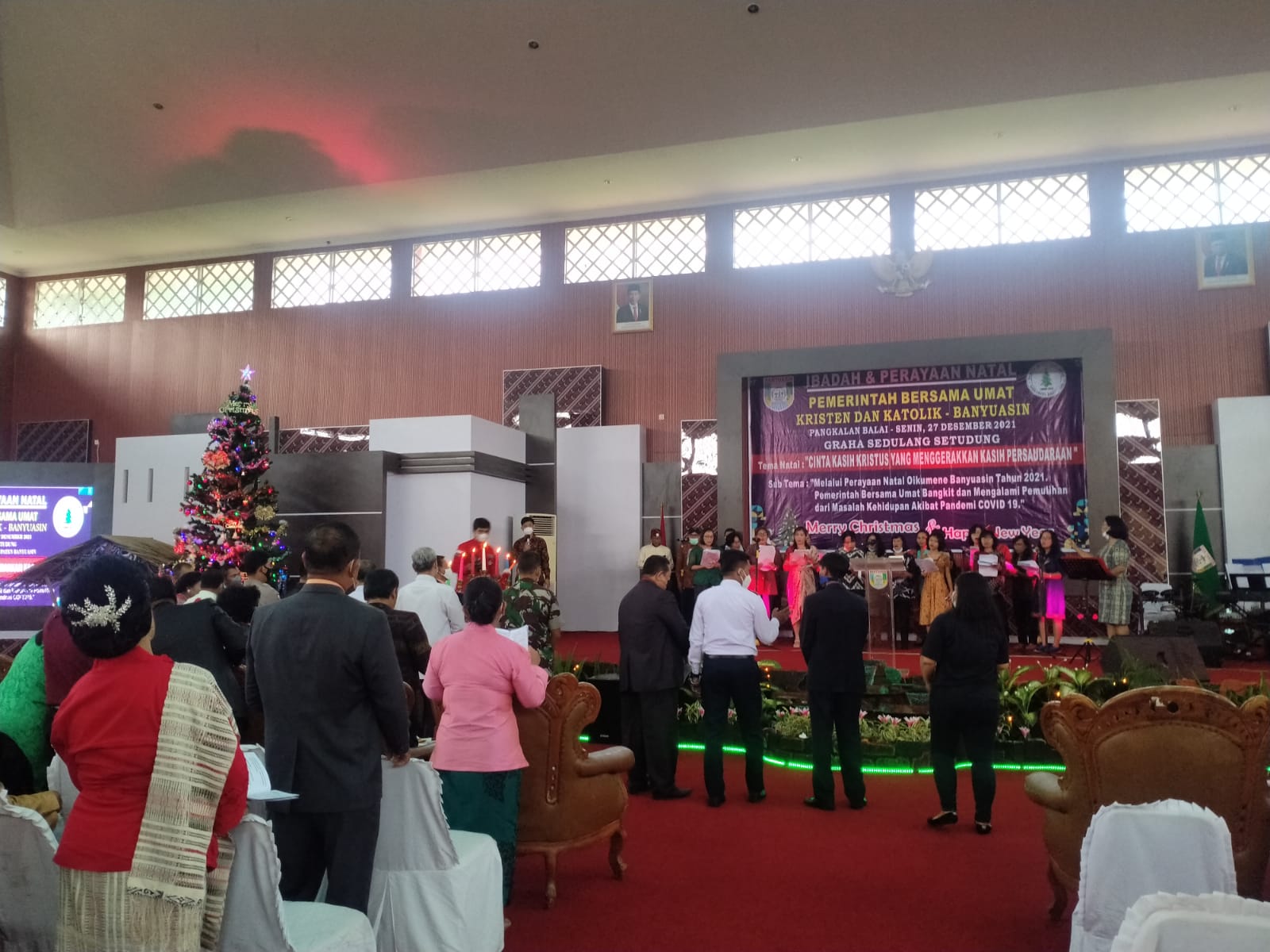 Kegiatan tersebut bertempat di Graha Sedulang Setudung Komplek Perkantoran Pemerintah Kabupaten Banyuasin, Senin (27/12/2021). Turut hadir Bupati dan Wabup Banyuasin, Polres Banyuasin, Kodim 0430/Banyuasin, Forkopimda dan para pendeta serta seluruh umat Kristen dan Katolik se-Kabupaten Banyuasin.