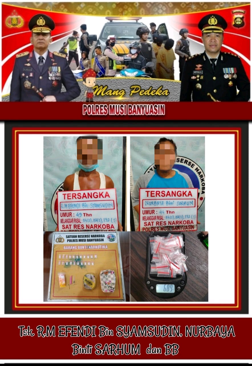 Sumsel, Siberindo.co- Peredaran Narkoba di tengah Pandemi Covid-19 masih terus beredar. Kali ini Suami-Istri asal Dusun II Desa Jirak Kecamatan Sungai Keruh Kabupaten Muba Sumsel diringkus dari kediamannya karena mengedarkan narkoba. Polisi berhasil menyita barang bukti 21 paket yang diduga sabu seberat 6,89 gram.