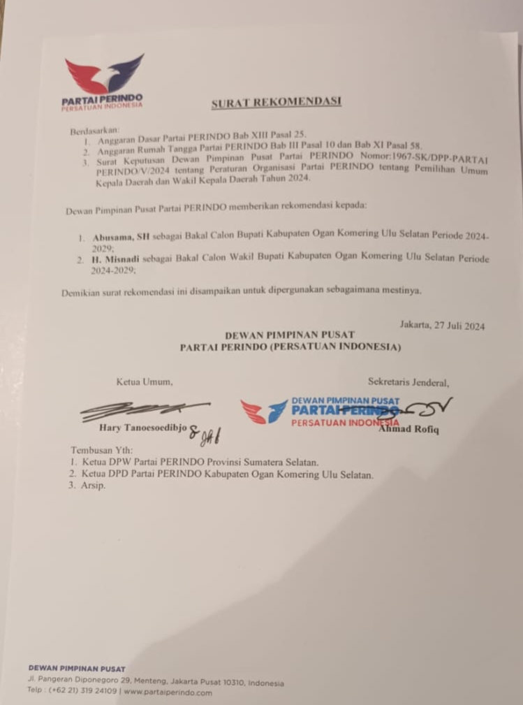 Hal itu dikarenakan pada Senin (29/07/2024) Malam, pasangan Abusama-Misnadi menerima dukungan dari Partai Perindo untuk maju di Pilkada OKU Selatan dengan memberikan tambahan satu kursi bagi pasangan Abusama-Misnadi.