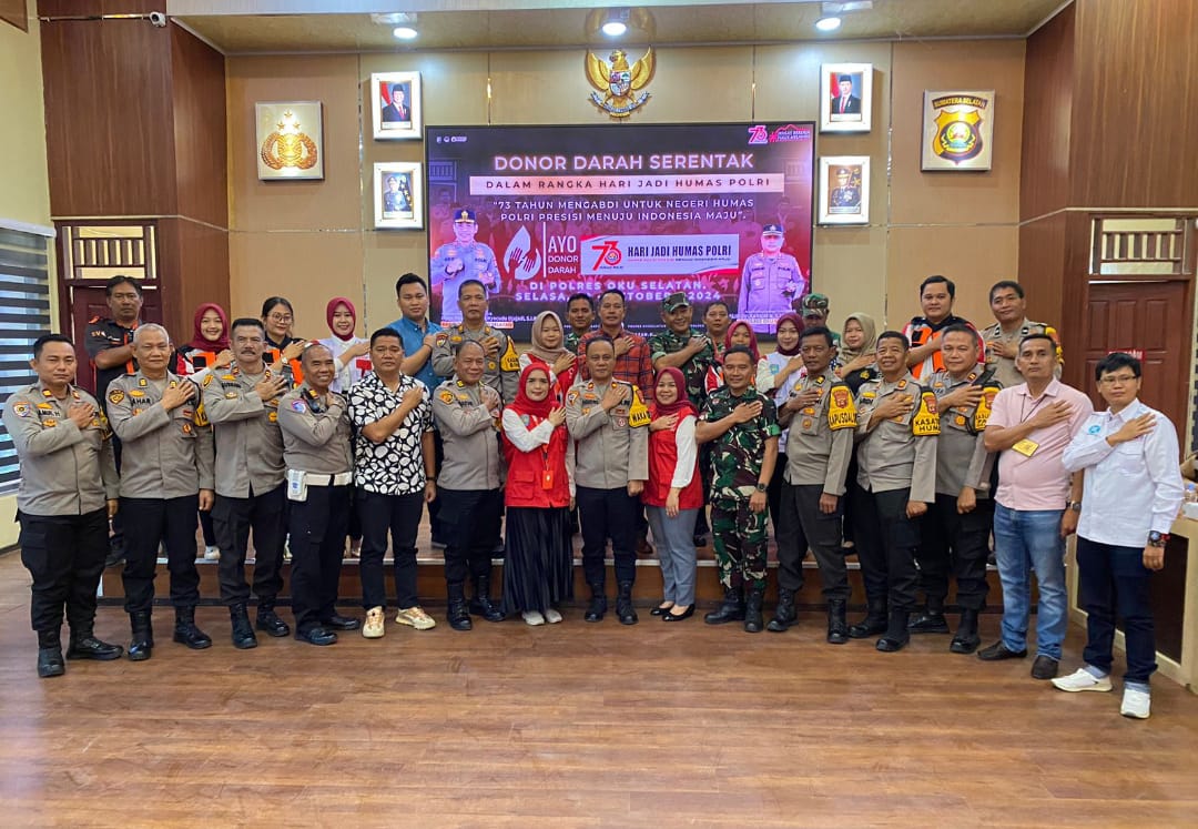 OKU Selatan Sumsel–Memperingati Hari Ulang Tahun (HUT) ke-73 Humas Polri, Kepolisian Resort (Polres) OKU Selatan menggelar kegiatan donor darah serentak pada Selasa (29/10/2024) di Aula Sertu Pol Anumerta Adinata Mapolres setempat.