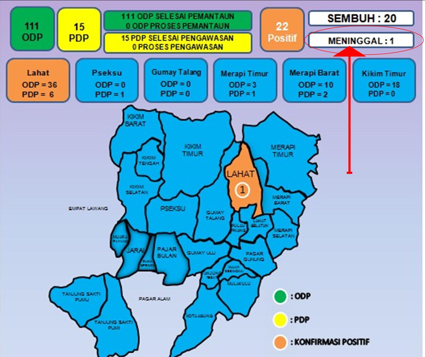 “Per pukul 15.00 hari ini, jumlah konfirmasi positip Covid 19 di Kabupaten Lahat tetap berjumlah 22 orang, masih dalam proses 1 orang dan meninggal 1 orang”, demikian disampaikan Ketua Gugus Tugas Covid-19 Kabupaten Lahat, Cik Ujang, SH didampingi Kadinkes, Ponco Wibowo, SKM, MM melalui Juru Bicara (Jubir)nya, TaufikMaryansah, SKM, MM di Posko Gusus Tugas Kantor Dinas Kesehatan Kabupaten Lahat.