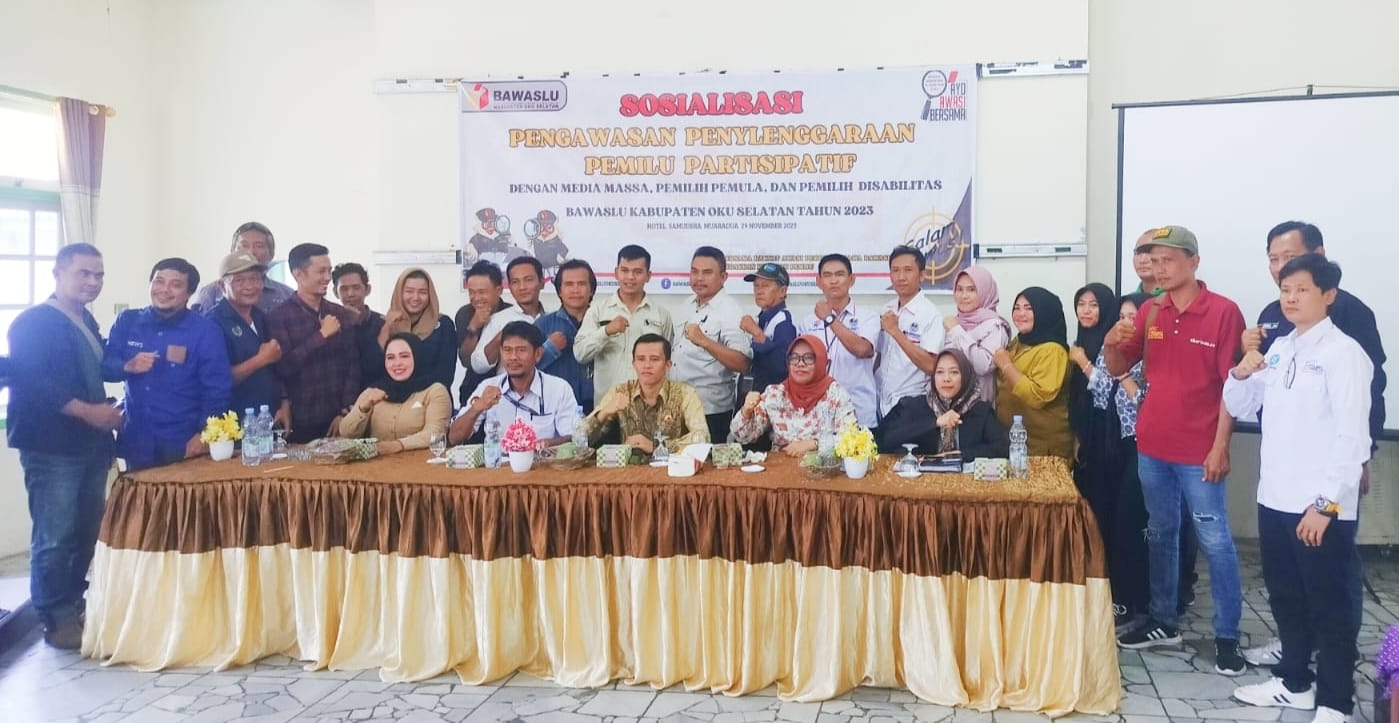 OKU Selatan Sumsel–Badan Pengawas Pemilu (Bawaslu) Kabupaten OKU Selatan gelar Sosialisasi Pengawasan Partisipatif Pemilu Tahun 2024 di Aula Hotel Samudra Muaradua, Rabu (29/11/2023). Peserta yang mengikuti sosialiasi terdiri dari insan pers, pemilih pemula dan pemilih disabilitas.
