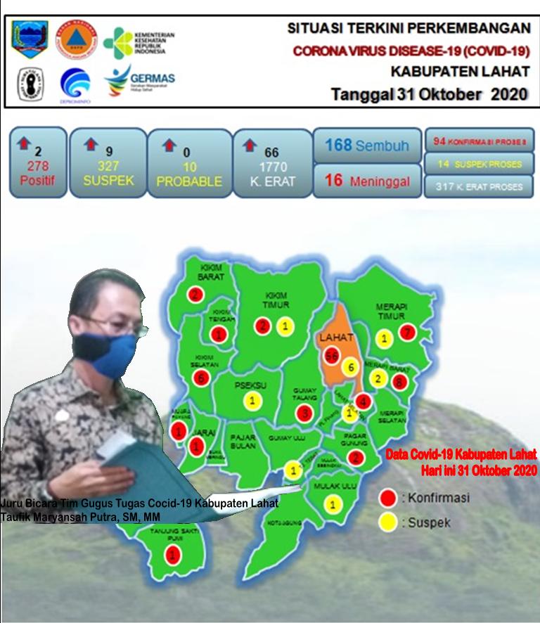 Seperti tercatat dalam data pasien di Posko percepatan penanganan penanggulan pandemi Covid-19 hari ini, Sabtu (31/10/2020), gugus tugas Covid-19 Kabupaten Lahat mengupdate jumlah Suspek FC dari data ODP dan PDP mencapai angka 327 orang. Dari data ini masih ada 14 orang yang dalam proses pemeriksaan, sisanya sudah dinyatakan sembuh.