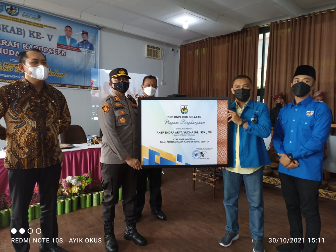 OKU Selatan Sumsel–Kapolres Ogan Komering Ulu (OKU) Selatan, AKBP, Indra Arya Yudha.,SH.,SIK.,MH, menerima penghargaan dari Komite Nasional Pemuda Indonesia (KNPI) Kabupaten OKU Selatan di Parita Pusri, kecamatan Buay Pematang Ribu Ranau Tengah (BPRRT) pada Sabtu 30 Oktober 2021.