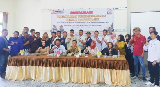 OKU Selatan Sumsel–Sosialisasi pengawasan partisipatif masyarakat digelar di hotel Samudra oleh Badan Pengawas Pemilu (Bawaslu) kabupaten OKU Selatan. Para peserta yang terdiri