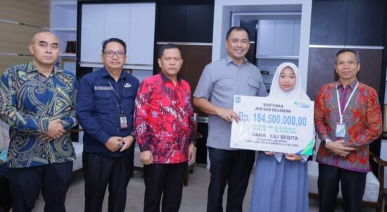 OKU Selatan Sumsel–Bupati Ogan Komering Ulu (OKU) Selatan Abusama menyerahkan secara simbolis santunan Jaminan Kematian (JKM) dan beasiswa pendidikan kepada ahli waris