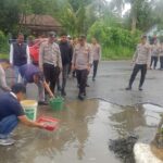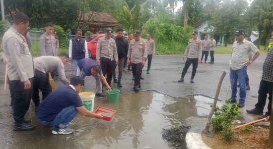 OKU Selatan, Sumsel–Puluhan personel Polres Ogan Komering Ulu Selatan (OKU Selatan) turun langsung memperbaiki jalan berlubang di kawasan Simpang Tiga Gunung Pasir,