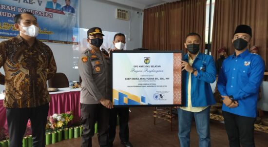 OKU Selatan Sumsel–Kapolres Ogan Komering Ulu (OKU) Selatan, AKBP, Indra Arya Yudha.,SH.,SIK.,MH, menerima penghargaan dari Komite Nasional Pemuda Indonesia (KNPI) Kabupaten OKU